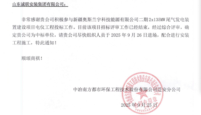 喜    报:山东诚联安装集团成功中标中冶南方都市环保总包的“新疆奥斯兰宇科技能源有限公司二期2×135MW尾气发电装置建设项目工程安装工程二标段”,合同金额1528万元。这标志着公司在能源环保工程领域的市场拓展再获突破,也将为行业技术创新与绿色低碳发展添力。(2025.07.10)
